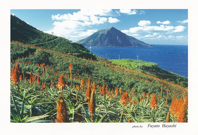 八丈小島をバックにたくさんのアロエの花が咲く。ここは八丈富士の麓にある約30万株のアロエが群生する自然公園で、12月上旬~2月にはアロエの赤い花が満開になる